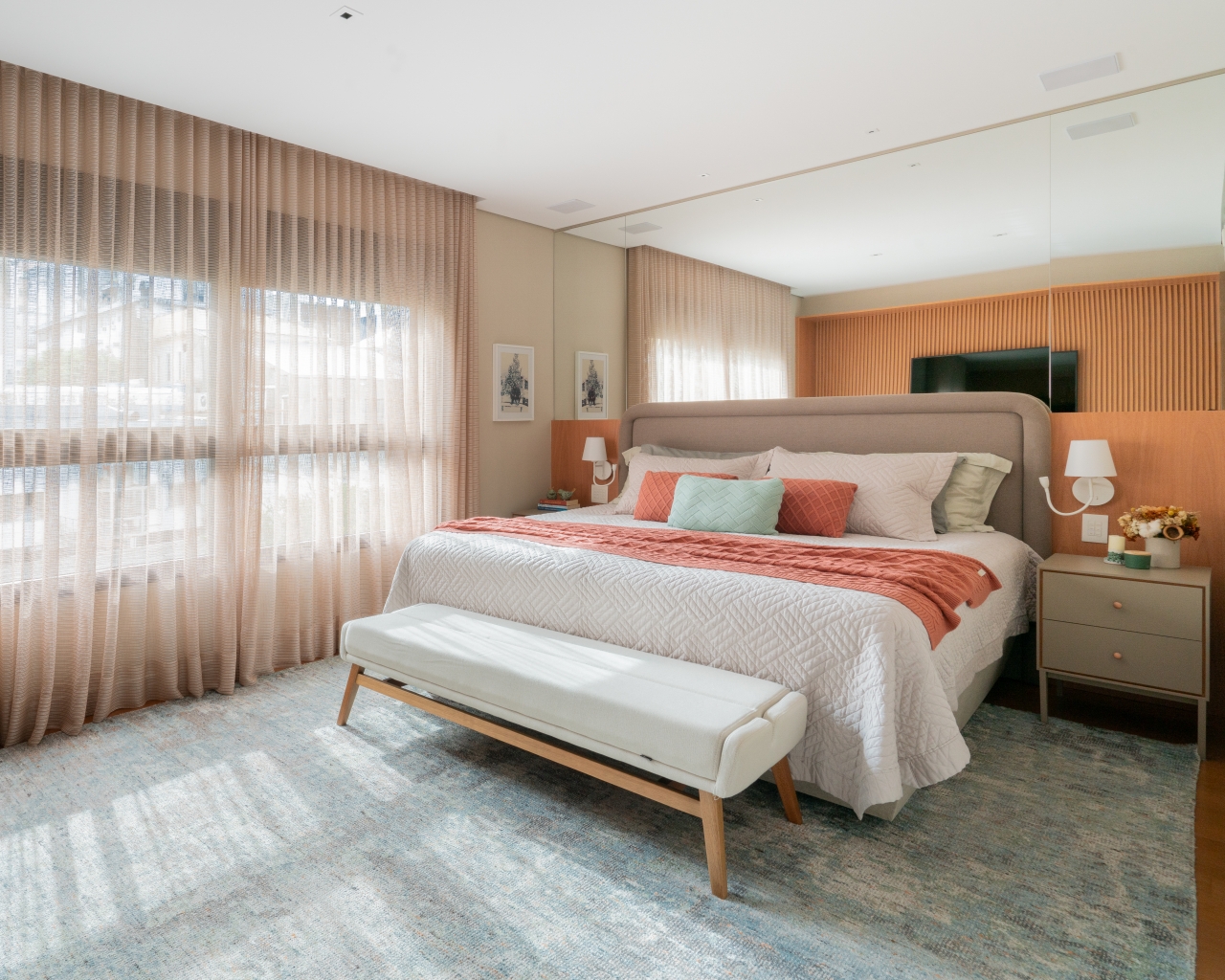 A automação é um ponto-chave na Suíte Master, com cenários de iluminação ajustáveis para diferentes momentos do dia. As cortinas motorizadas garantem praticidade e integração total ao sistema tecnológico do apartamento, proporcionando conforto e modernidade ao casal.