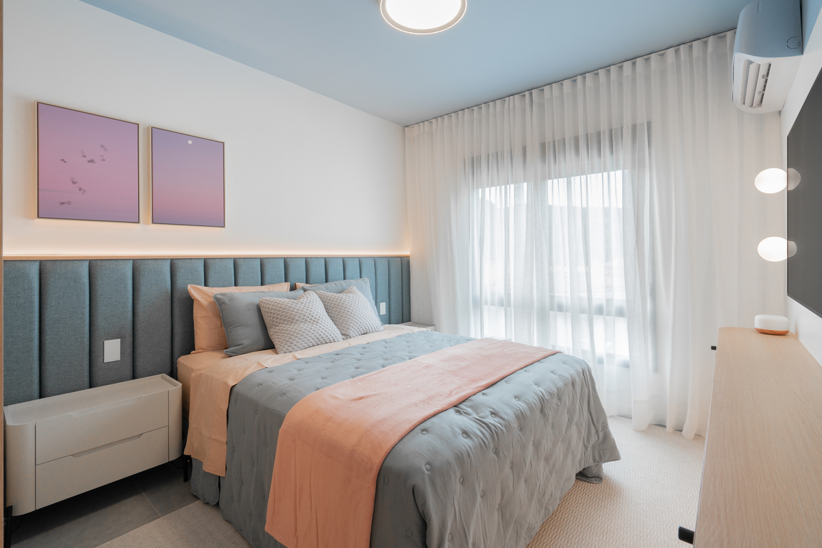 suíte, que foi pensada para ser o verdadeiro refúgio dos clientes. A ideia era criar um espaço que fosse não só bonito, mas também confortável e funcional, trazendo uma paleta de cores suaves e detalhes que fazem a diferença.A primeira coisa que chama atenção é o teto azul, pintado na cor