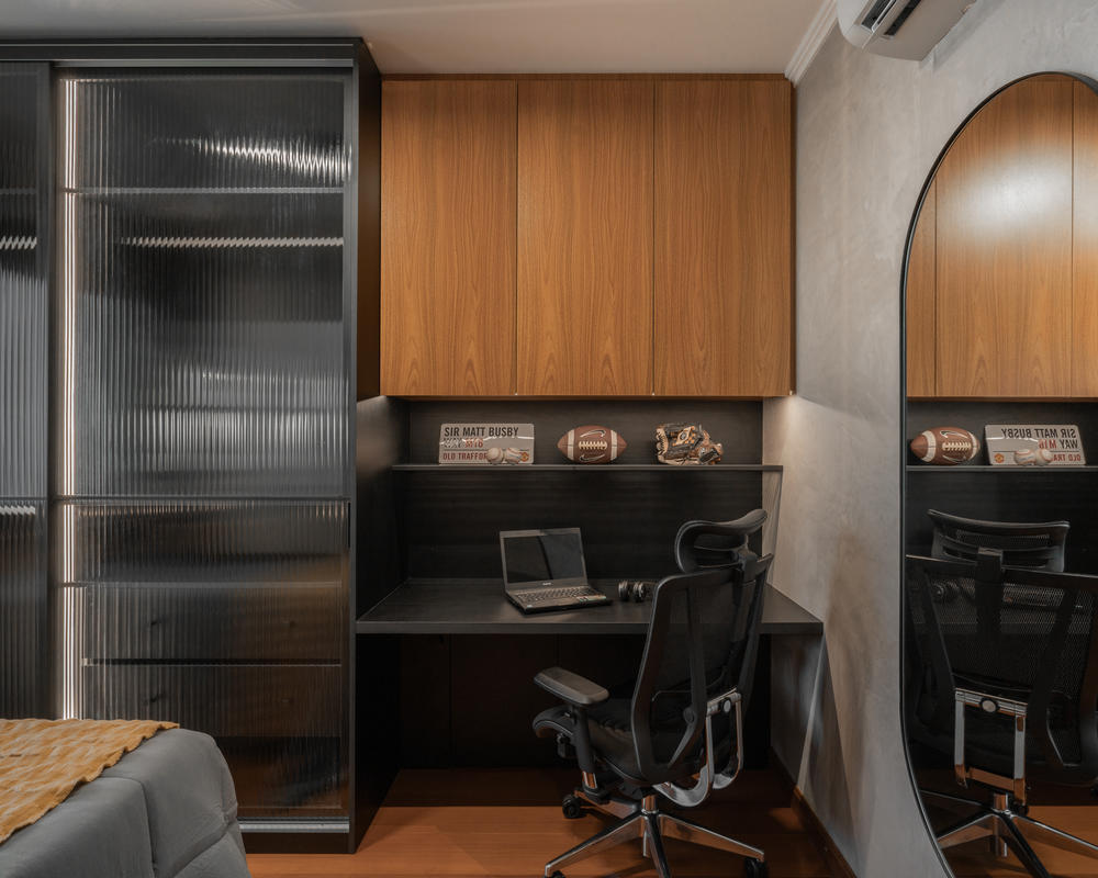 O dormitório do filho foi projetado para ser um espaço versátil que atende às suas necessidades como fotógrafo e profissional home office. O layout foi otimizado com uma cama de casal encostada na parede, que funciona também como um sofá com almofadas, criando um ambiente multifuncional. Ao redor da cama, um painel de marcenaria serve como cabeceira e inclui nichos para carregar dispositivos, enquanto o roupeiro com portas de vidro canelado e iluminação interna maximiza o armazenamento de roupas e equipamentos. A bancada de trabalho, com uma cava para esconder a fiação dos monitores, proporciona um espaço limpo e organizado. A paleta de cores em tons de cimento, preto e madeira, junto com uma parede de galeria com porta-retratos, adiciona um toque pessoal e moderno. O resultado é um quarto que combina eficiência, conforto e estilo, perfeito para o trabalho e o descanso.
