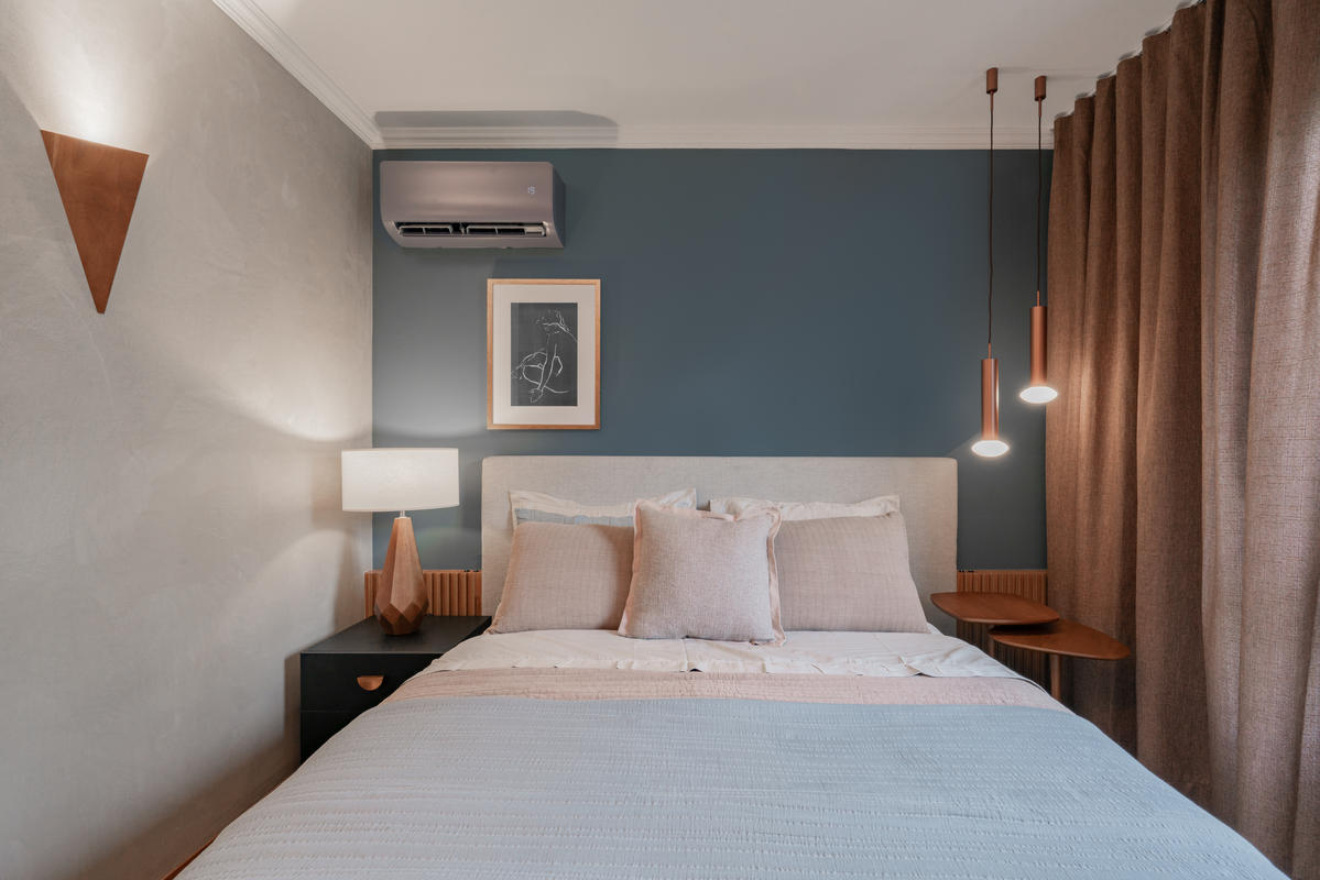 A reforma da suíte neste apartamento de Porto Alegre trouxe um novo nível de sofisticação e conforto, combinando estilo moderno e funcionalidade. O layout foi mantido, mas o ambiente foi revitalizado com uma nova paleta de cores e acabamentos elegantes. A parede atrás da cama foi pintada em um tom de azul profundo, complementado por uma cabeceira ripada e estofada, e pendentes em cobre que harmonizam com as cortinas de linho. O móvel planejado ao lado da cama proporciona armazenamento para a coleção de relógios e óculos, enquanto o roupeiro com portas de vidro canelado e iluminação interna facilita a visualização das roupas. O resultado é uma suíte que combina funcionalidade e estética, refletindo a personalidade dos moradores e oferecendo um espaço confortável e elegante para relaxar.
